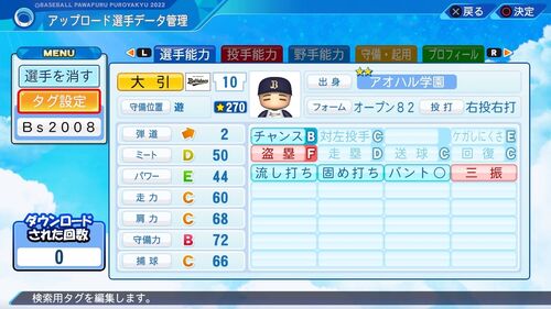 パワナンバー:12200 40398 99682 名前:大引 啓次(おおびき けいじ)出身:大阪府生年月日:84/6/29背番号:10経歴:浪速高→法大→オリックス(’07~’12)→日本ハム(’13~’14)→ヤクルト(’15~’19)投打:右・右 2008年成績88試合 率.258(275-71) 3HR 26打点 略歴…